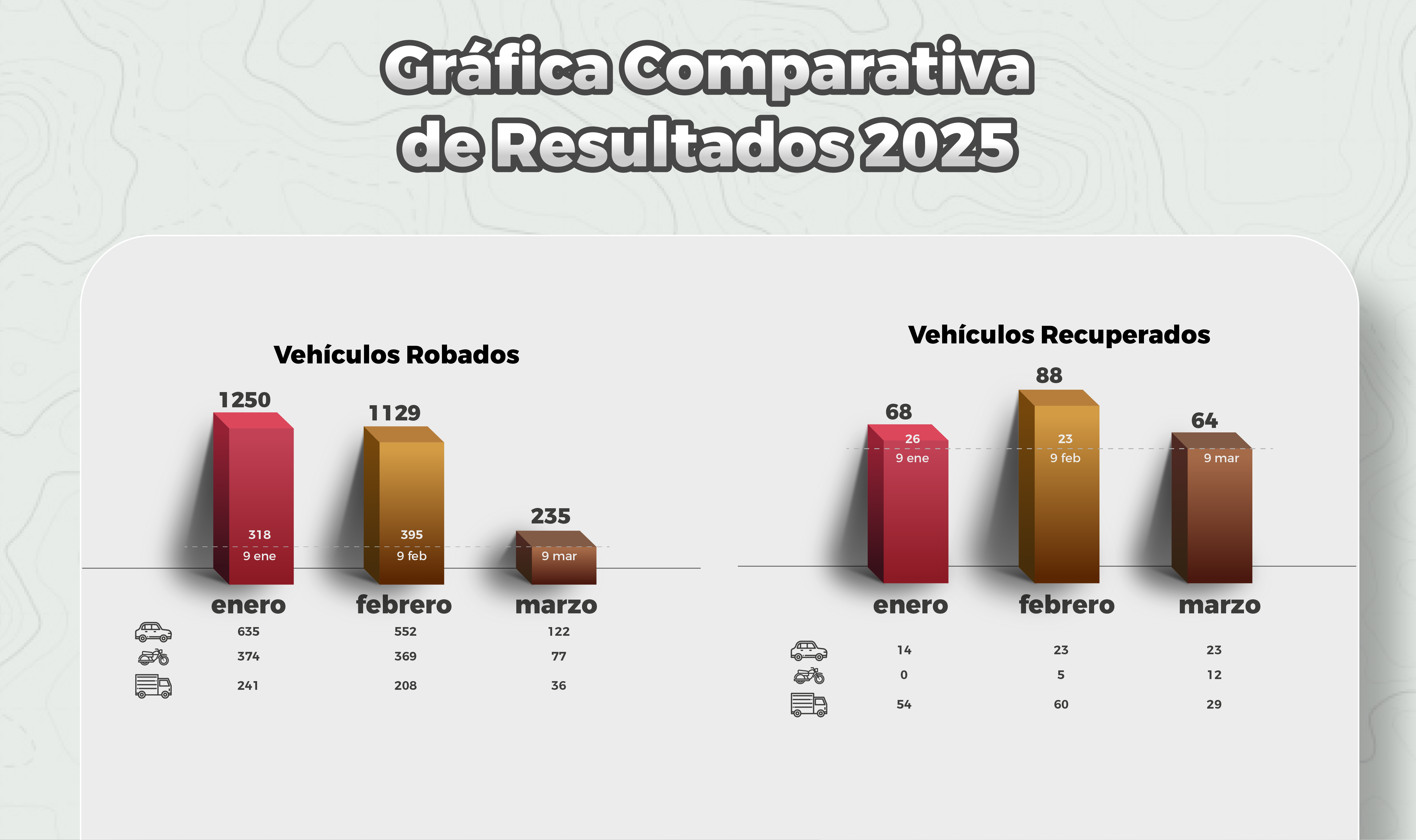 Ávila Alcocer detalló que en el mes de enero, de mil 250 vehículos robados se recuperaron 68; en febrero, de los mil 129 robos registrados se logró la recuperación de 88, mientras que en lo que va de marzo, de los 235 transportistas despojados se han encontrado 64 unidades.