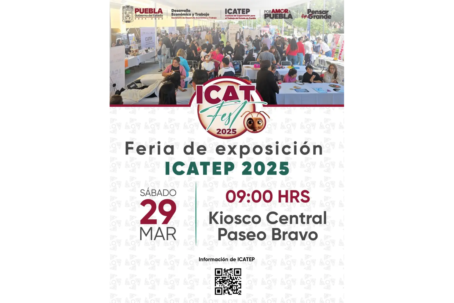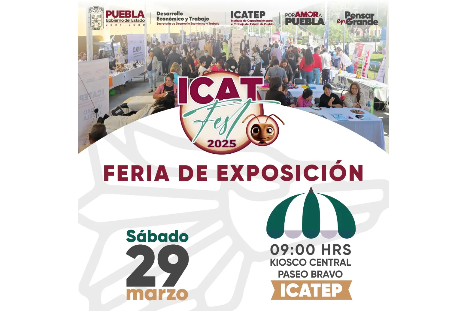 CIUDAD DE PUEBLA, Pue.- El Gobierno del Estado de Puebla, que lidera Alejandro Armenta, busca fortalecer las competencias laborales y fomentar el emprendimiento en diversas áreas productivas a favor de las y los poblanos, por tal motivo, a través del Instituto de Capacitación para el Trabajo del Estado de Puebla (ICATEP), llevará a cabo el “ICATFEST”, una feria de exposición de cursos y productos. El evento se celebrará el sábado 29 de marzo, en el horario de 9 a 15 horas, en el Kiosco del Paseo Bravo.