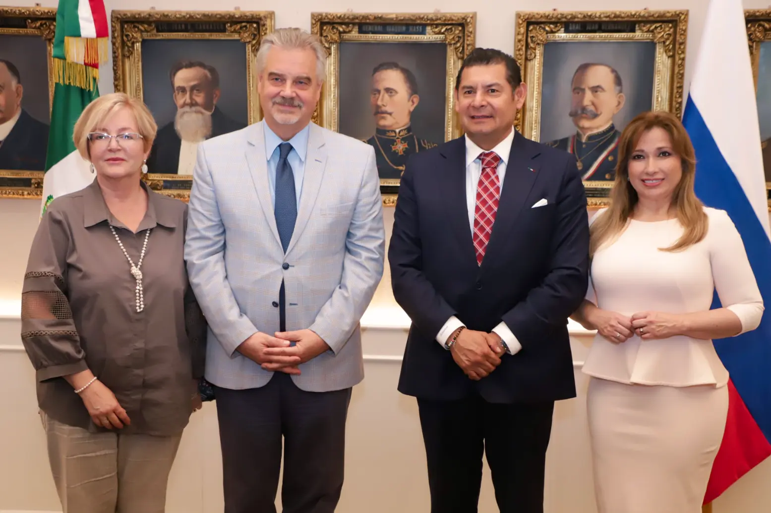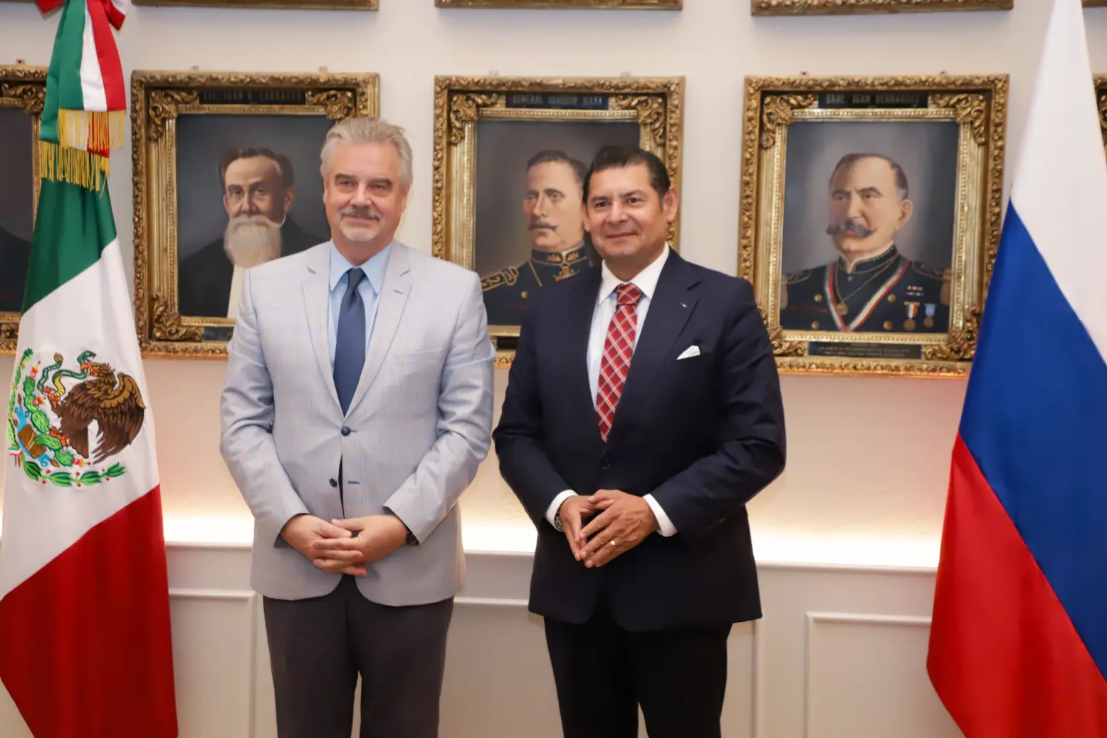 CIUDAD DE PUEBLA, Pue.— En un acto protocolario que subrayó la próxima celebración de 135 años de relaciones diplomáticas entre México y Rusia, el gobernador Alejandro Armenta recibió al Excelentísimo Embajador Nikolay V. Sofinskiy, en el Salón Gobernadores del Antiguo Palacio de Gobierno. La reunión tuvo como objetivo consolidar los lazos culturales, educativos y tecnológicos entre Puebla y la Federación Rusa.