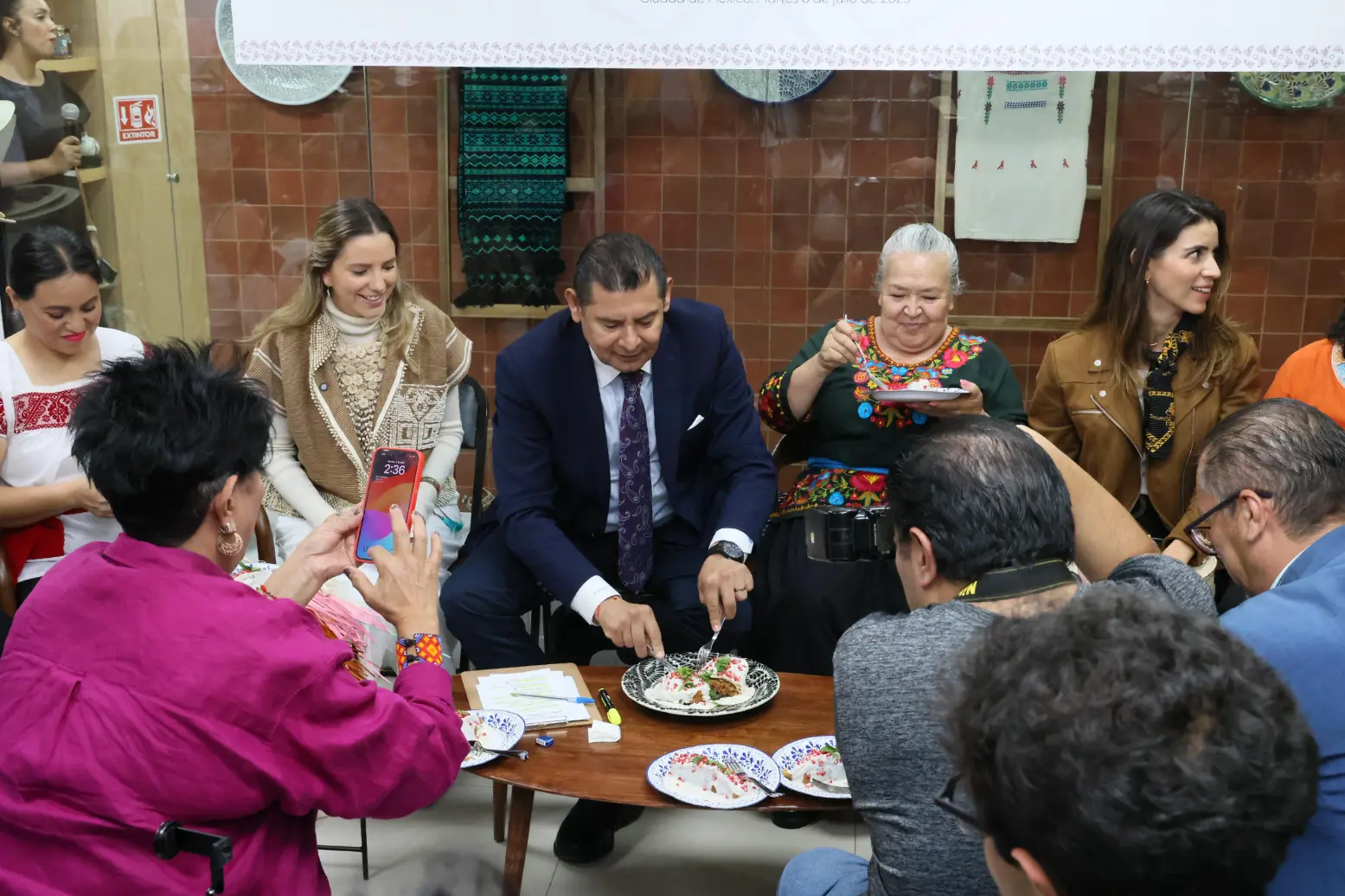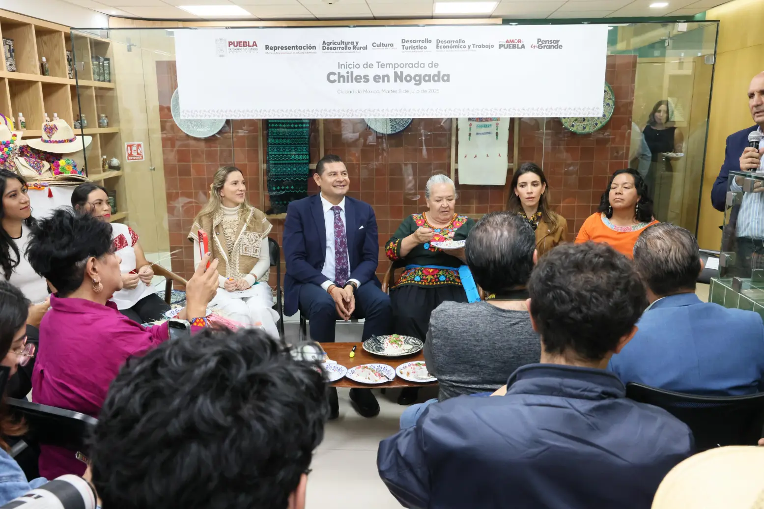 Acompañado por cocineras tradicionales, artesanos productores de la marca “Puebla Cinco de Mayo” y funcionarios de su gabinete, el mandatario Alejandro Armenta resaltó que el Chile en Nogada le da identidad al Estado y a nuestro país, pues es sabor y color, además de representar a uno de los platillos tradicionales que aún conserva elementos artesanales en su preparación.