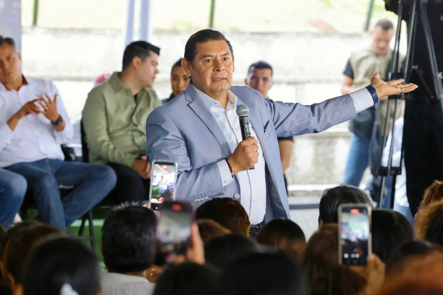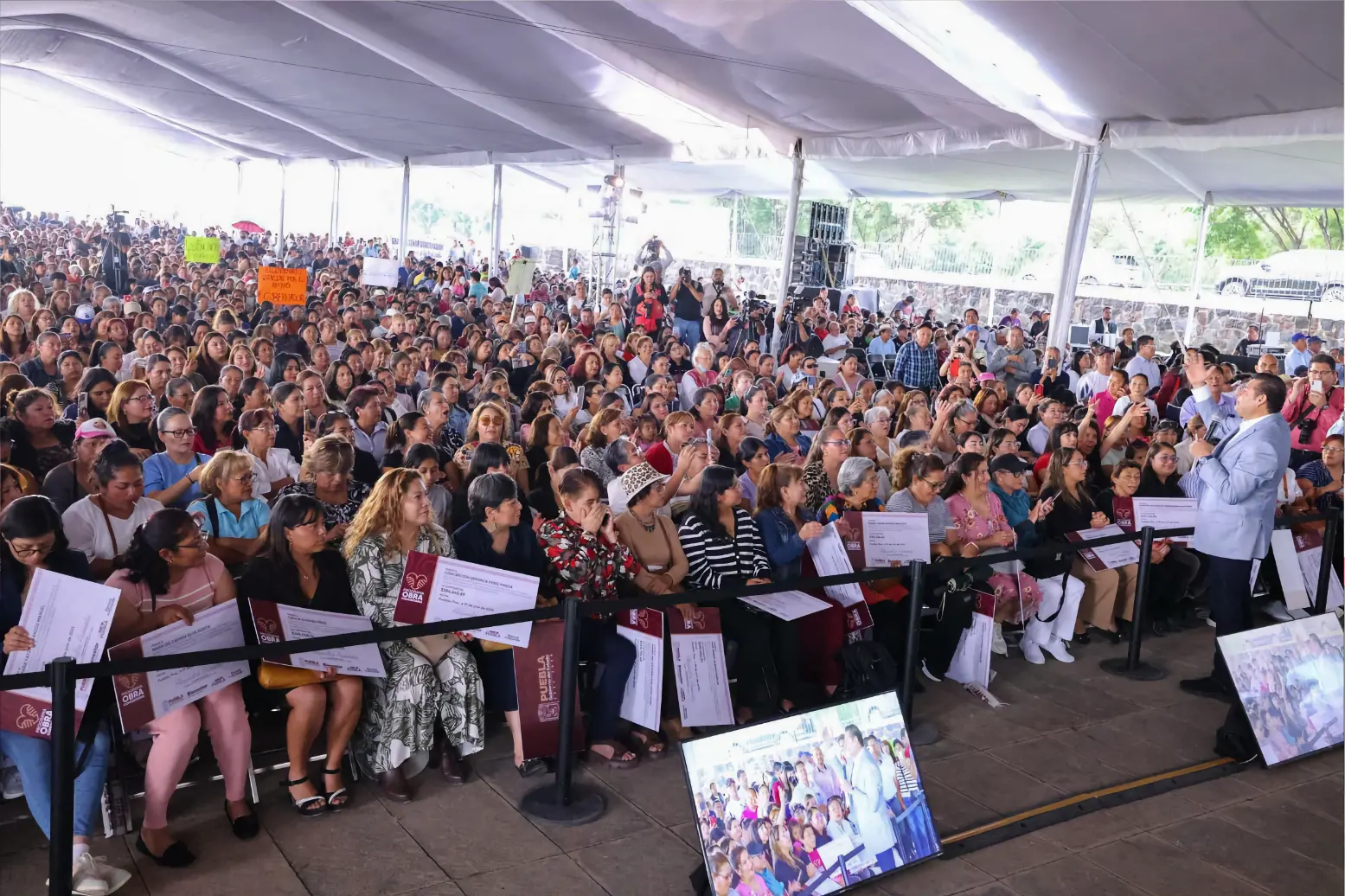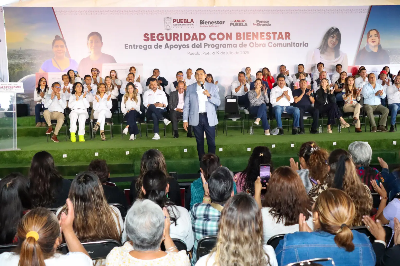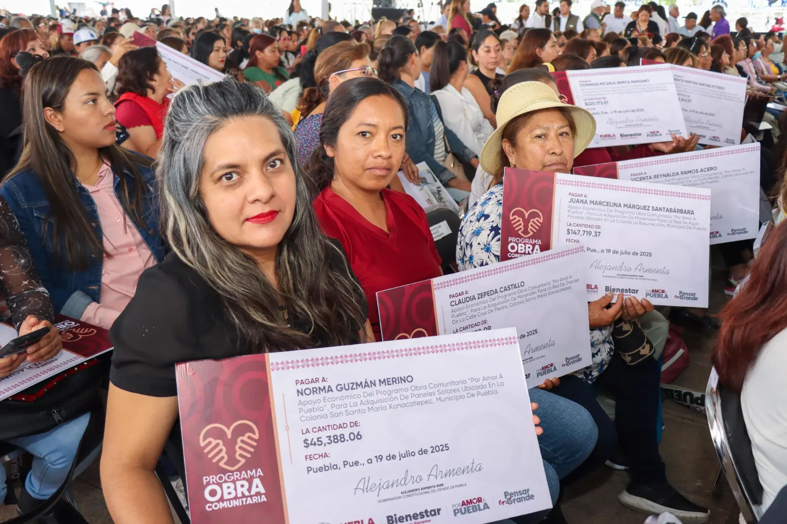CIUDAD DE PUEBLA, Pue.- En medio de una intensa lluvia, el gobernador de Puebla, Alejandro Armenta, encabezó en la explanada de Plaza La Victoria, en la histórica zona de Los Fuertes, la entrega de más de 70 millones de pesos en 283 apoyos del programa “Obra Comunitaria”, iniciativa enfocada en seguridad con bienestar, justicia social y participación ciudadana.