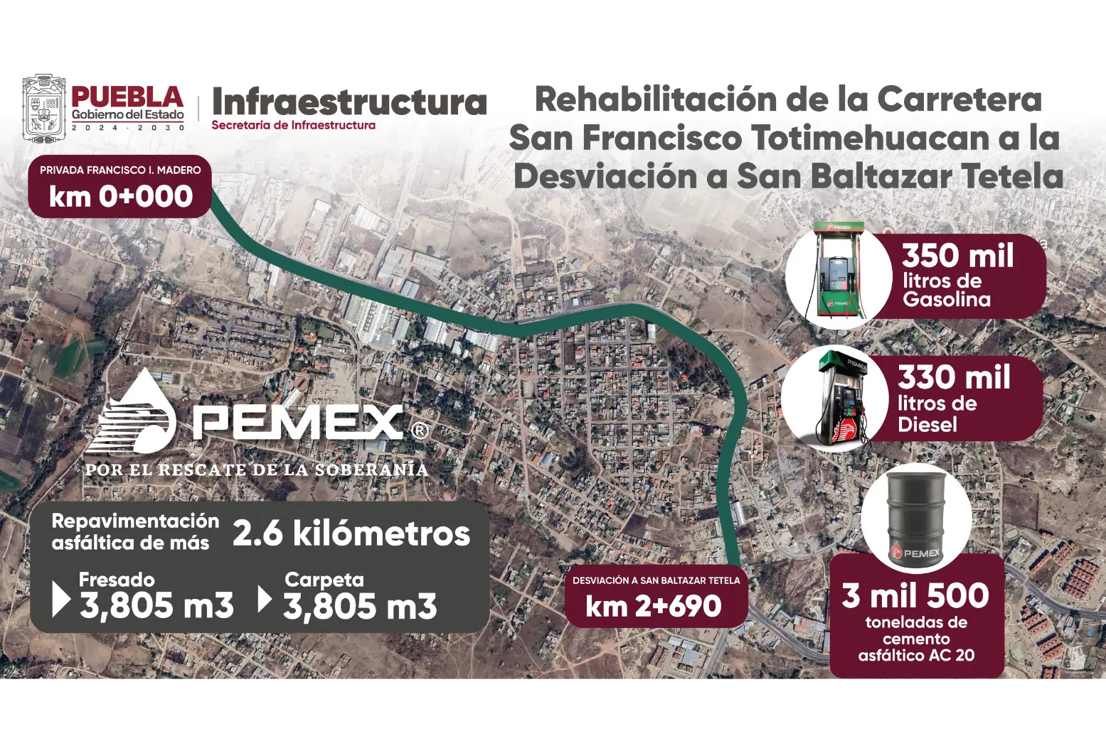 - Carretera San Francisco Totimehuacan-Presa Manuel Ávila Camacho-Los Ángeles Tetela, intervendrán 16 mil metros cuadrados (23 calles).
