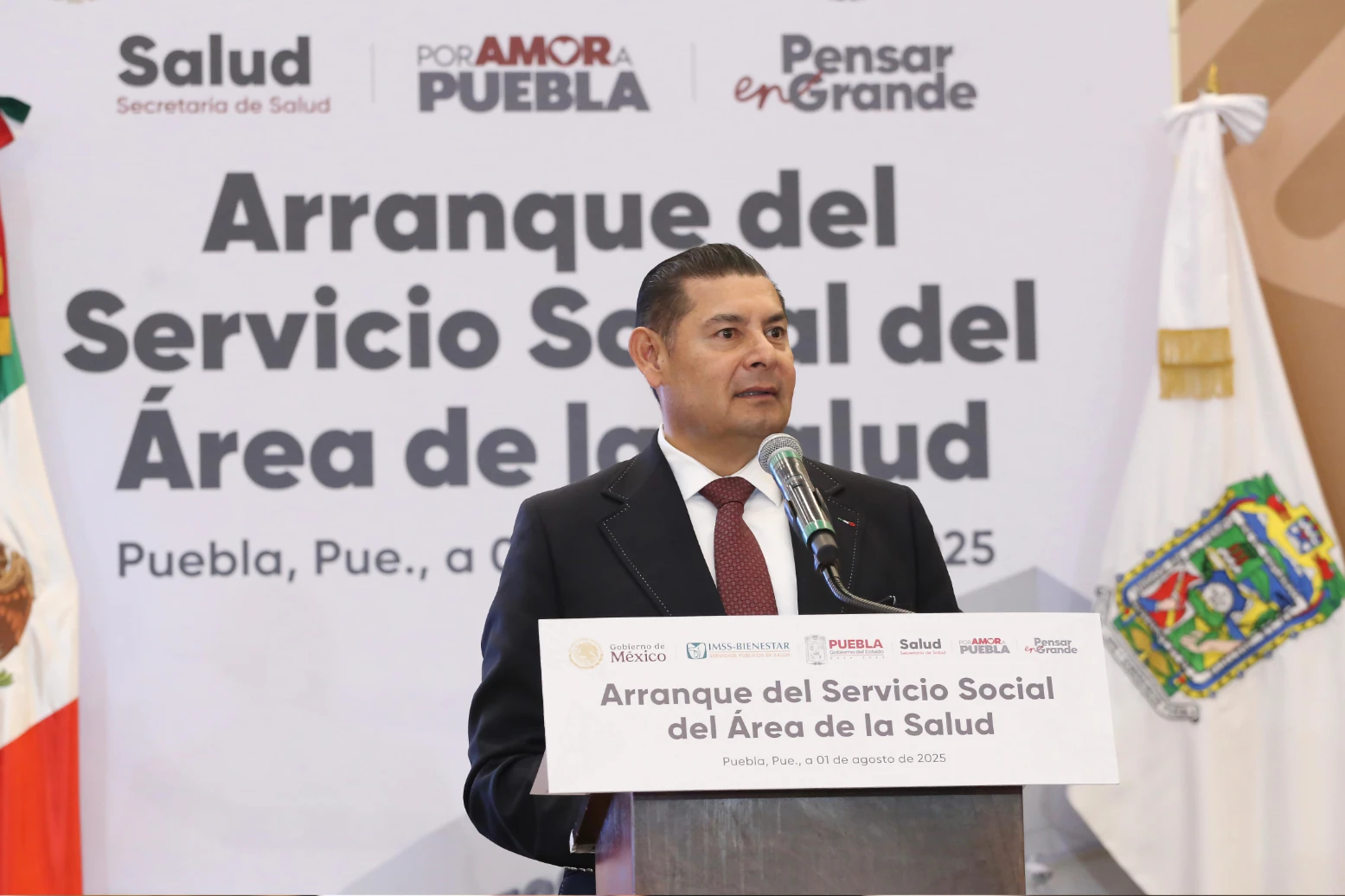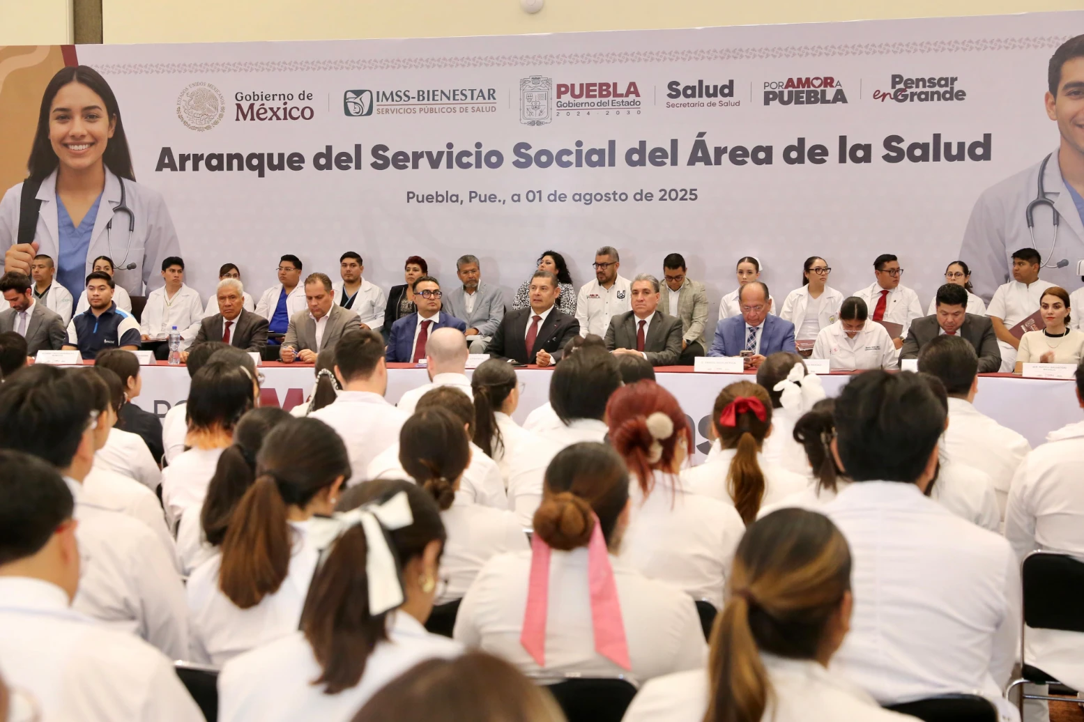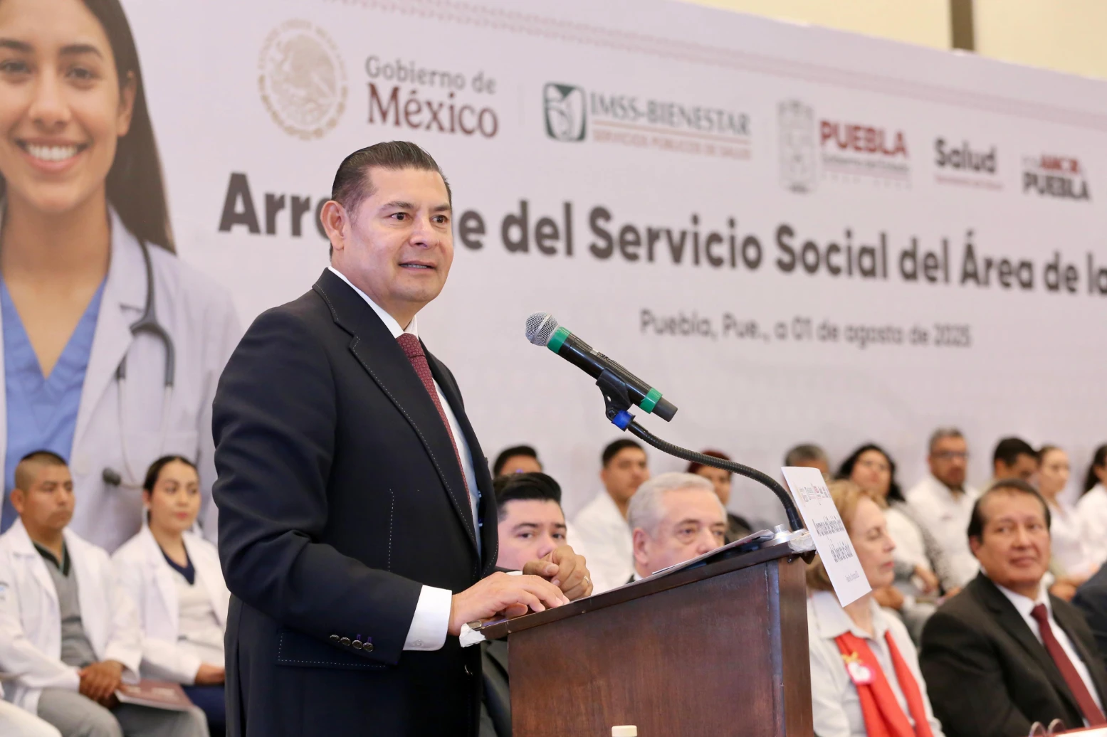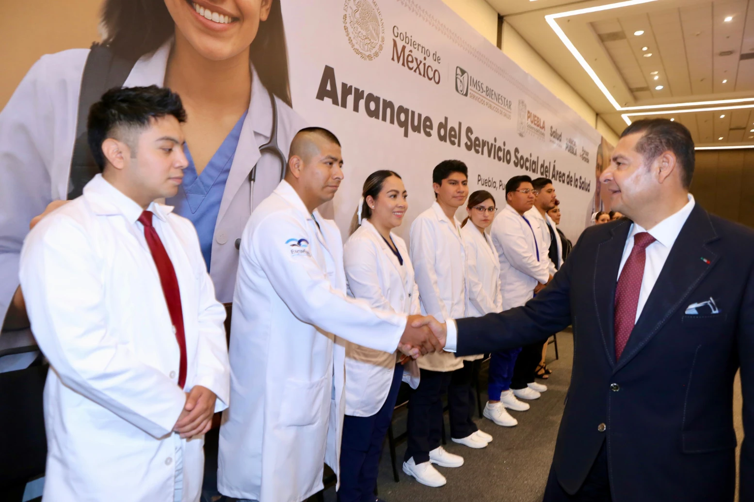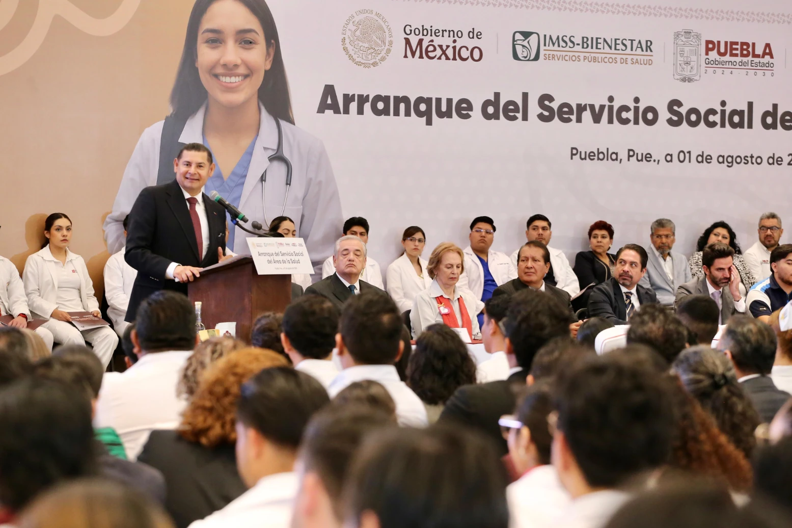 CIUDAD DE PUEBLA, Pue.- El gobernador de Puebla, Alejandro Armenta, encabezó el arranque oficial del Servicio Social del Sector Salud, donde más de 4 mil estudiantes de más de 150 instituciones educativas iniciarán su formación profesional en hospitales y unidades médicas de todo el estado, gracias al convenio entre el Gobierno del Estado y el IMSS-Bienestar.