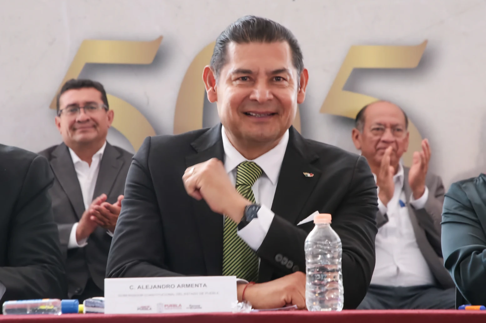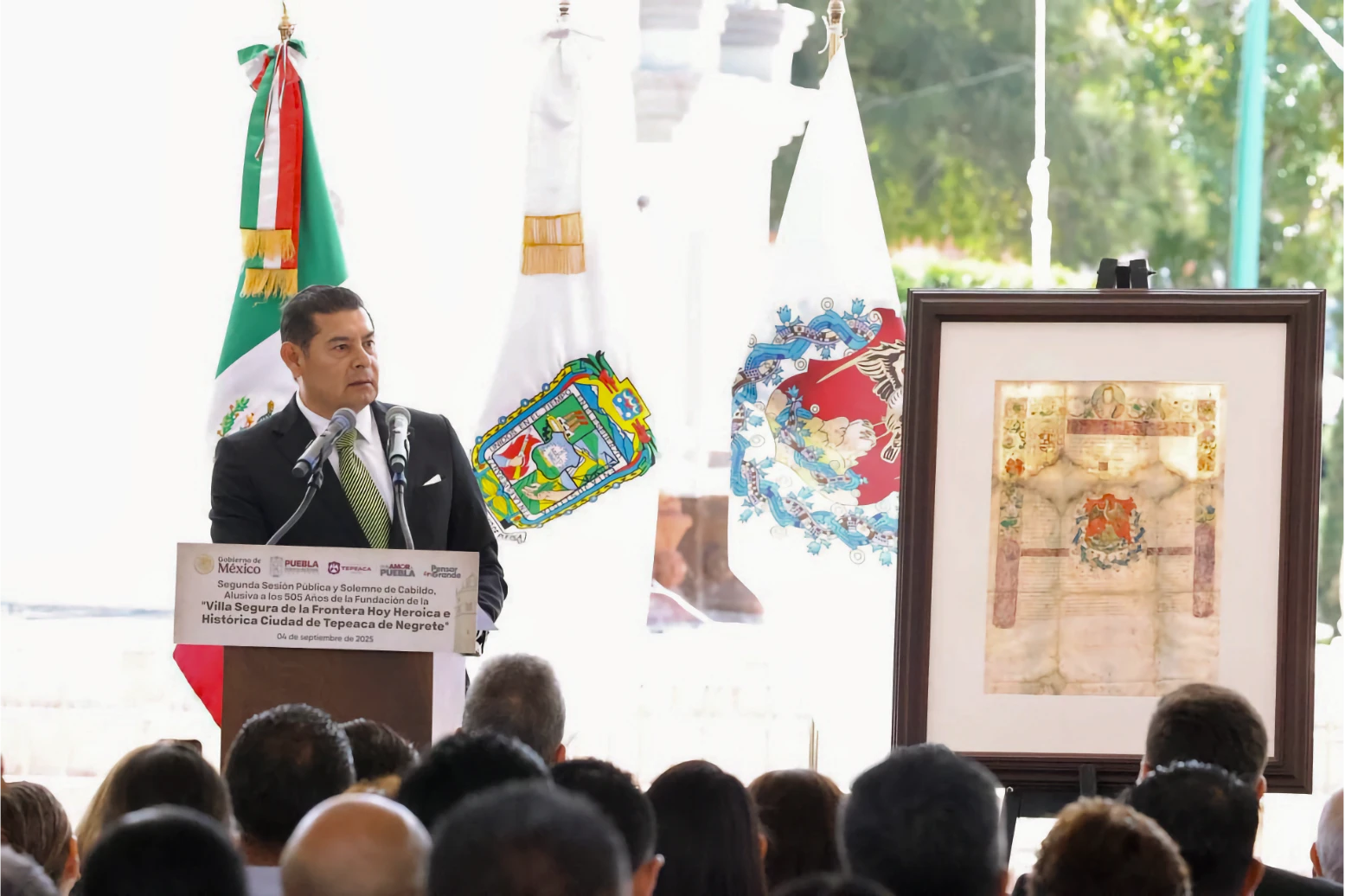 • El gobernador de Puebla, Alejandro Armenta, recibió la copia de la Cédula Real como visitante distinguido e hijo adoptivo del municipio.
