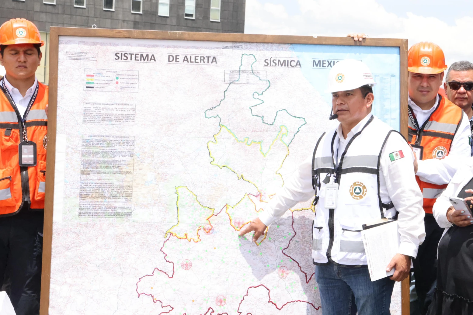 El coordinador estatal de Protección Civil, coronel Bernabé López Santos, entregó el parte oficial al mandatario estatal, destacó que el simulacro en Puebla se ejecutó bajo la hipótesis de un sismo de magnitud 8.1, con epicentro en Lázaro Cárdenas, Michoacán. Detalló que se implementaron protocolos de seguridad como la inhabilitación de elevadores y escaleras eléctricas, revisión de instalaciones eléctricas y estructurales, y el acompañamiento de brigadas multifuncionales en los procesos de evacuación.
