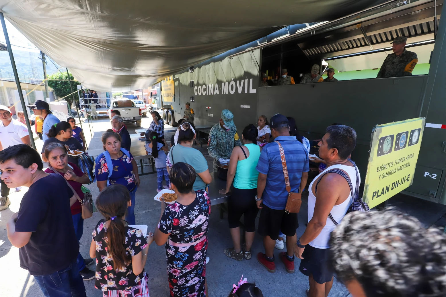 La Secretaría de la Defensa Nacional implementó desde primer momento el Plan DN-III-E, movilizaron tres aeronaves, una cocina móvil, una planta potabilizadora, un hospital militar, entre otros recursos. Las acciones que han llevado a cabo son la entrega de más de 3 mil despensas, 56 litros de agua embotellada, mil raciones calientes de alimentos y evacuaron en lancha a 12 personas.