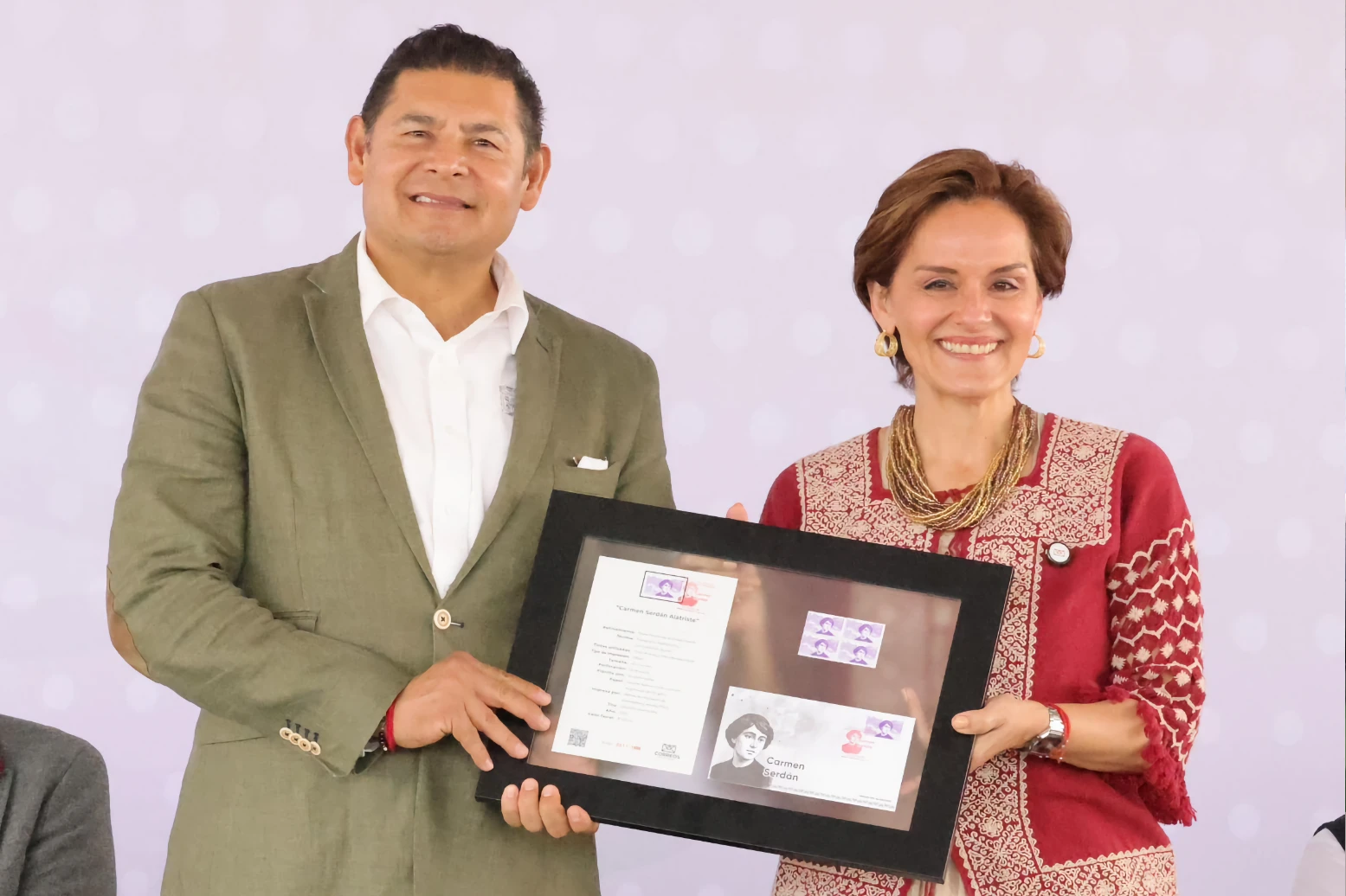 La directora general de Correos de México, Violeta Abreu González, y el gobernador Alejandro Armenta, encabezaron la cancelación de la estampilla postal conmemorativa a “Carmen Serdán”.
