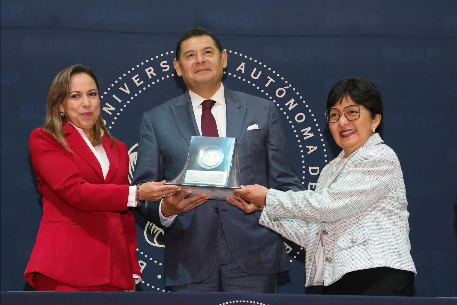 La rectora Lilia Cedillo entregó un reconocimiento al mandatario por su destacada trayectoria pública.