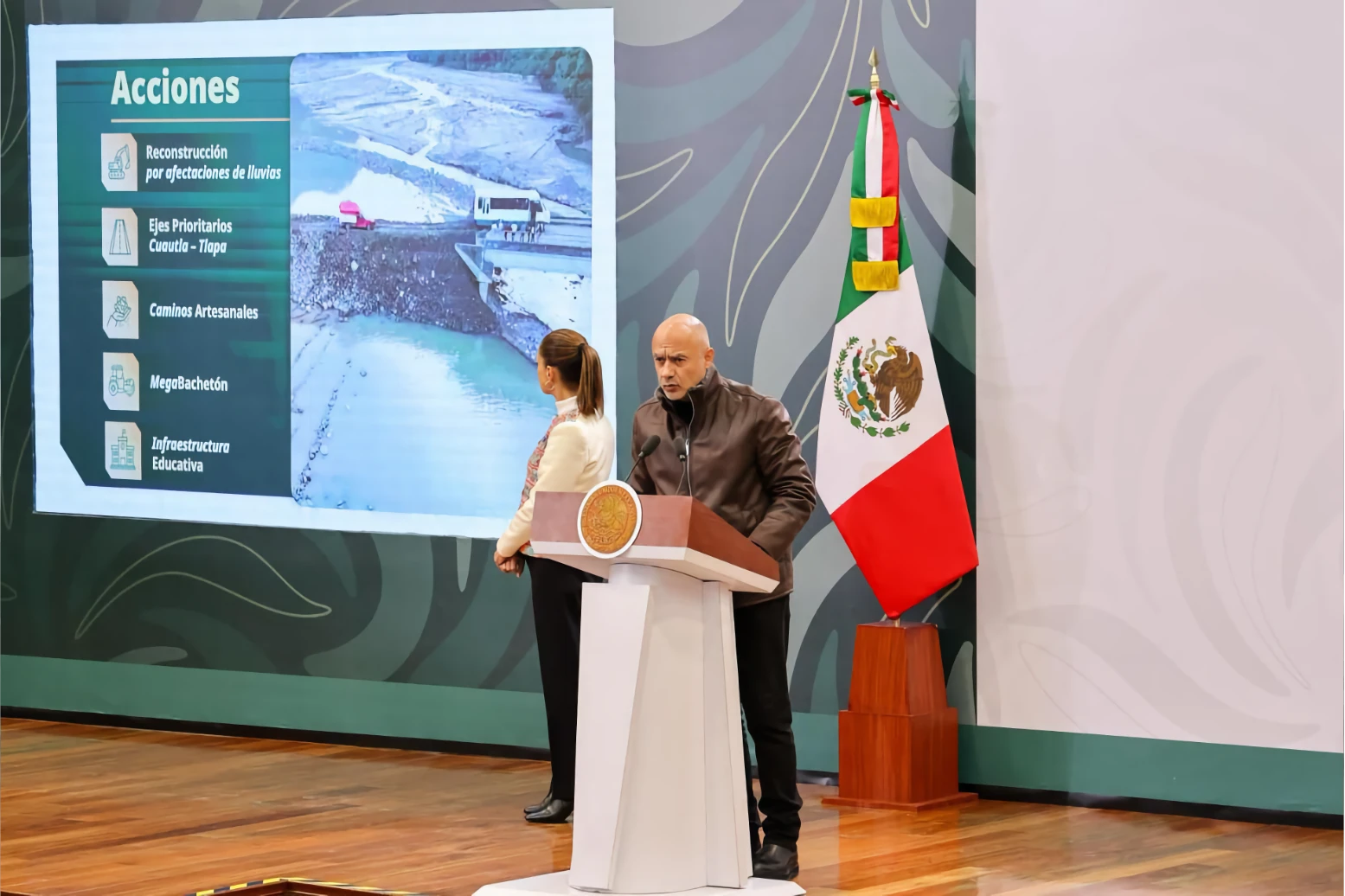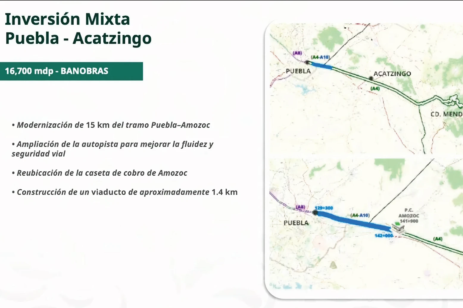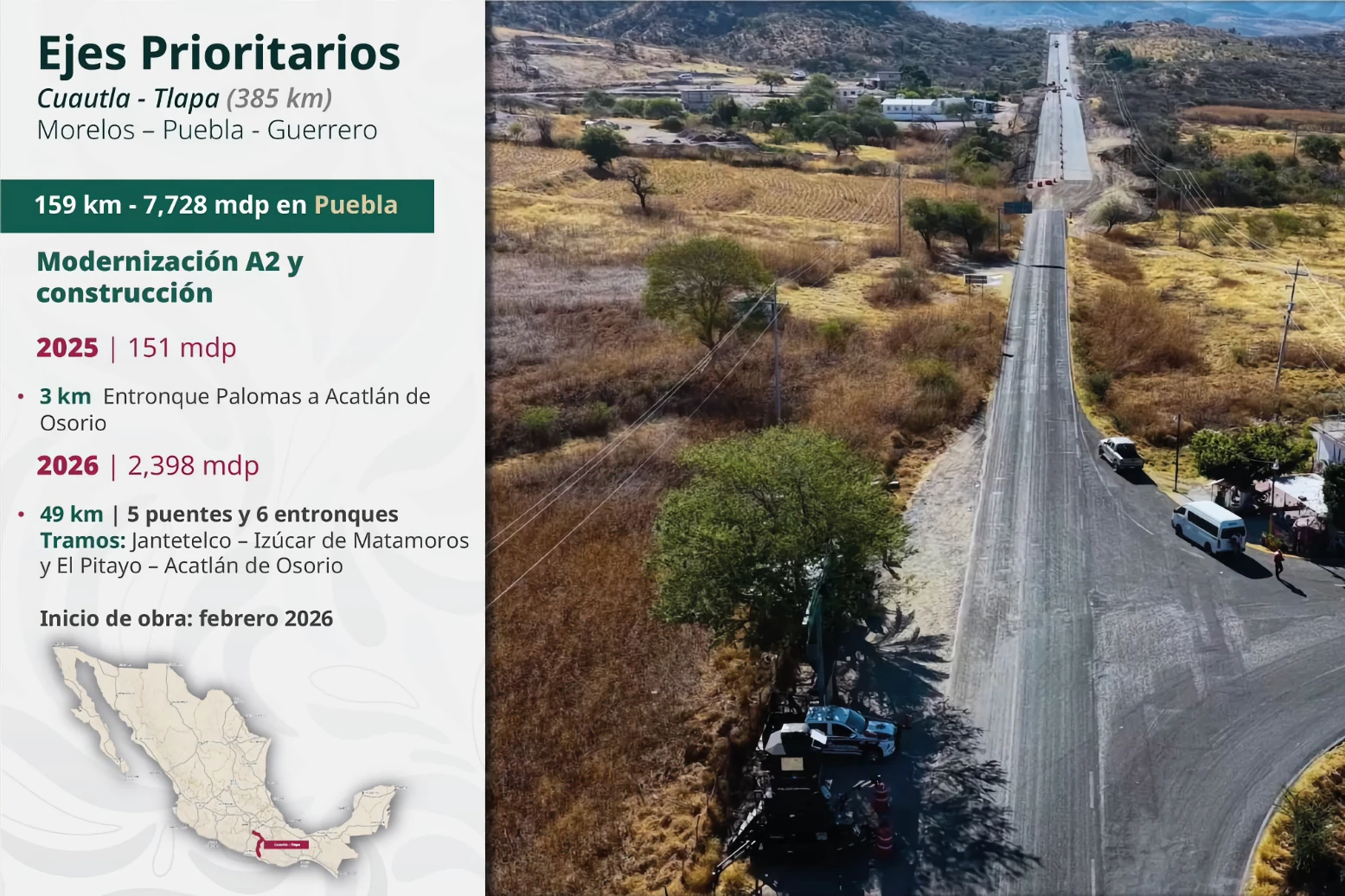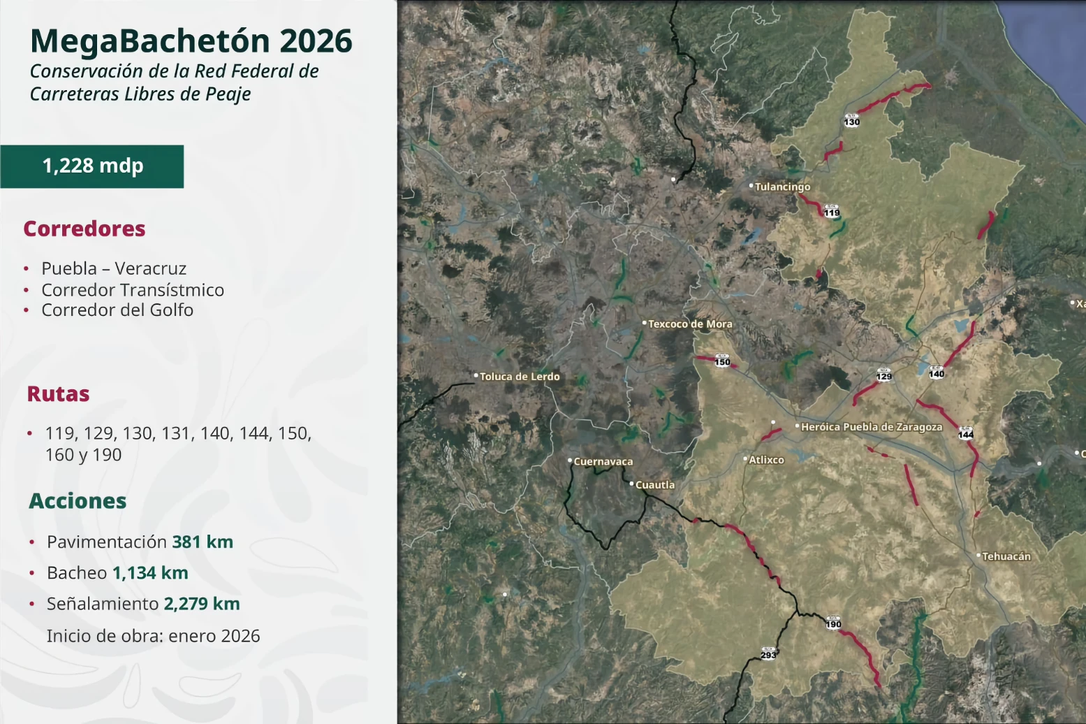 El secretario de Infraestructura, Comunicaciones y Transportes, Jesús Antonio Esteva Medina, explicó que el Gobierno Federal interviene la red federal y estatal de carreteras. En esta primera se ejecutan 25 acciones que abarcan tres kilómetros, mientras que en la segunda se realizan 53 acciones en 612 kilómetros, con trabajos de estabilización de taludes, obras de drenaje y construcción de muros de contención. Además, se atienden 22 puentes que suman dos kilómetros, mediante 12 rehabilitaciones, siete nuevas construcciones y ampliaciones. Las obras iniciarán en marzo.