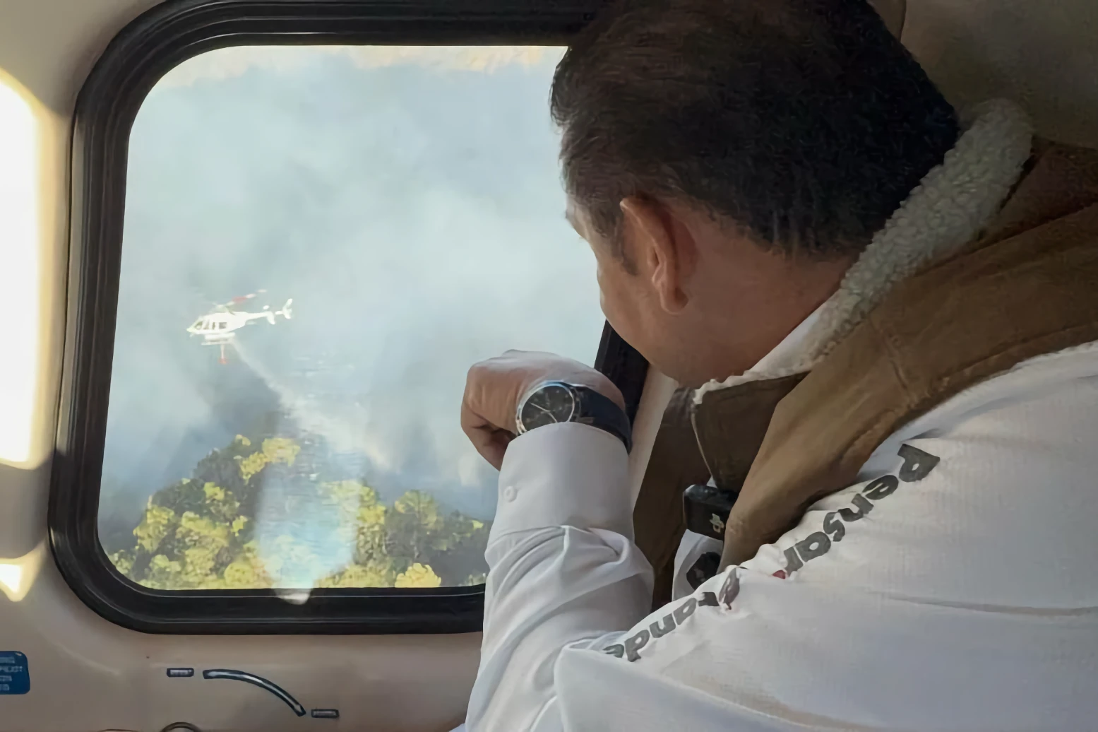 Desde el aire, el mandatario constató las acciones estratégicas que permitan contener y extinguir el fuego a la brevedad, las cuales son ejecutadas por elementos de Protección Civil del Estado, Policía Forestal, Comisión Nacional Forestal (CONAFOR) y la Brigada Coyote 7.