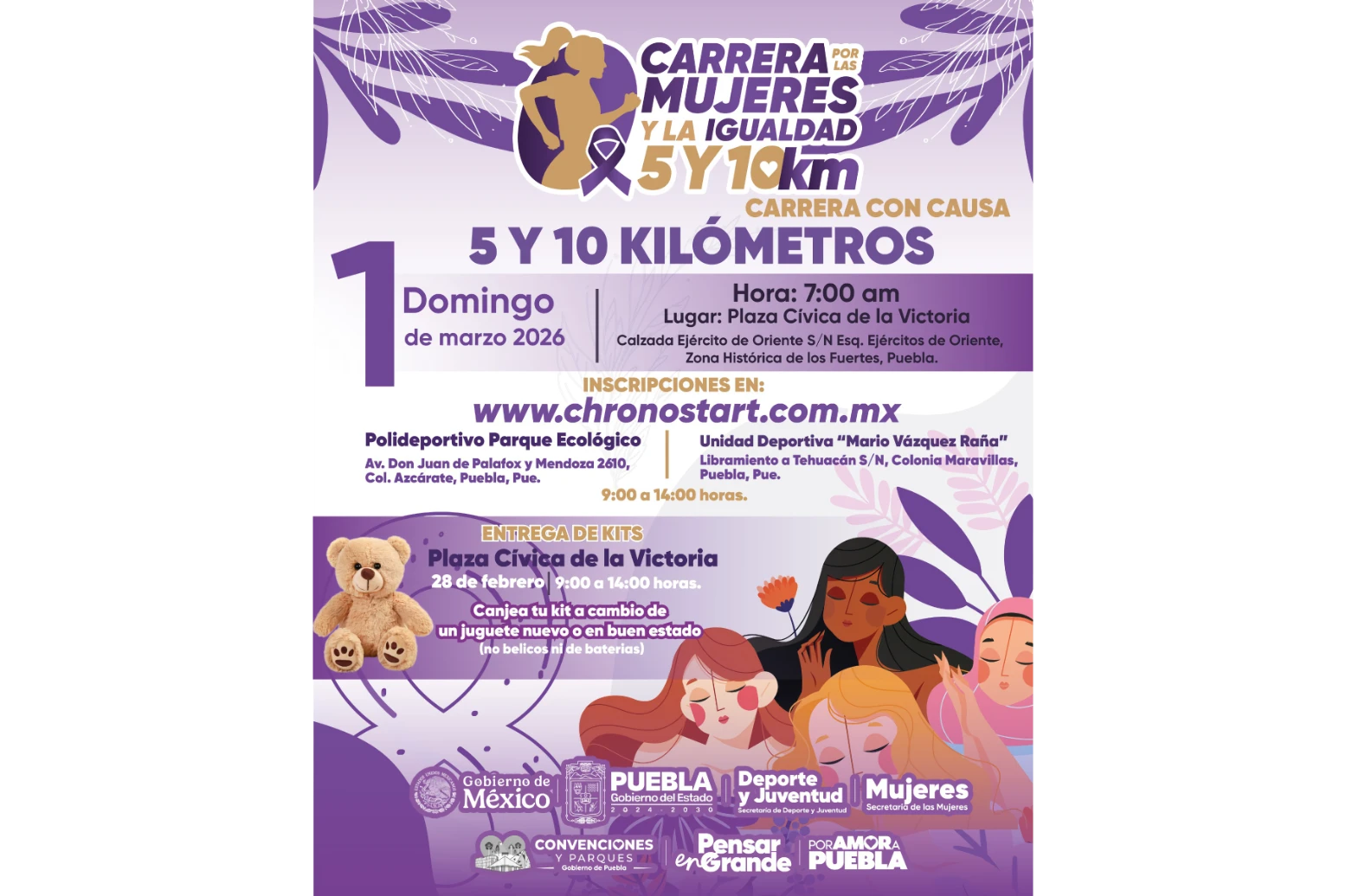 CIUDAD DE PUEBLA, Pue.- Con la finalidad de visibilizar la contribución invaluable de las mujeres en cada sector de la sociedad, el próximo 1 de marzo se llevará a cabo la Carrera por las «Mujeres y la Igualdad», con la participación de 3 mil corredoras, resaltó el gobernador Alejandro Armenta Mier.