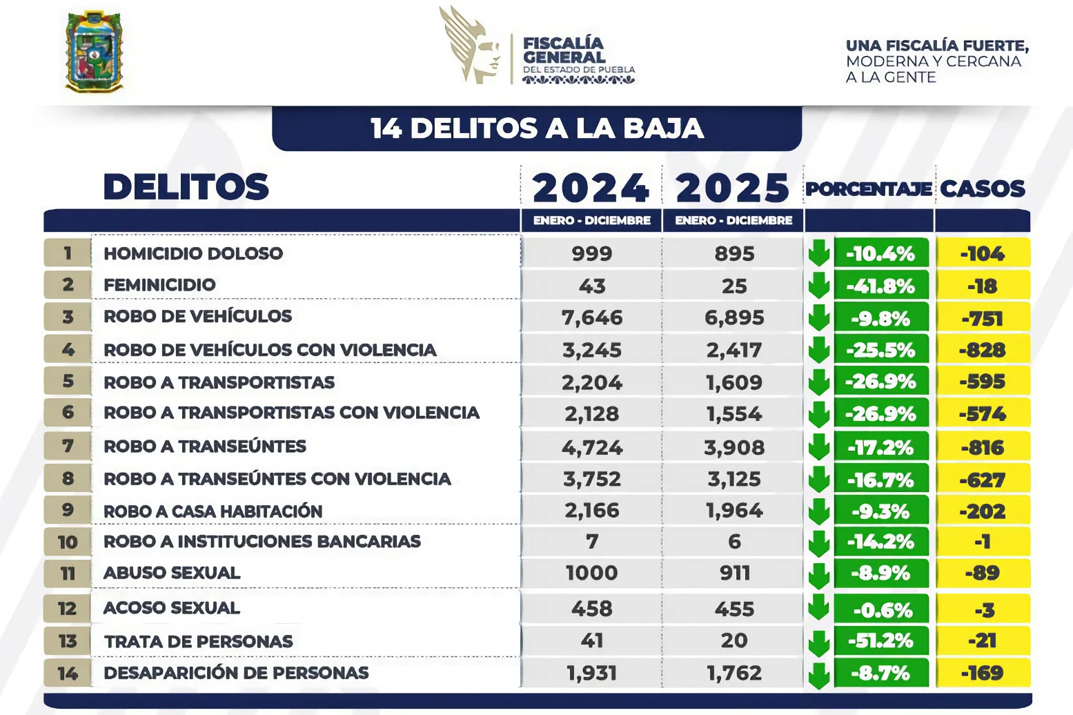 La Fiscal General del Estado de Puebla, Idamis Pastor Betancourt, informó que, de los 21 delitos que registraron una disminución, destaca la baja de 66.6 por ciento en feminicidios, 50 por ciento en secuestro y 62.5 por ciento en secuestro extorsivo. Asimismo, precisó que durante el periodo reportado se realizaron 536 cateos, se intervinieron 694 inmuebles y se aseguró a 478 personas.